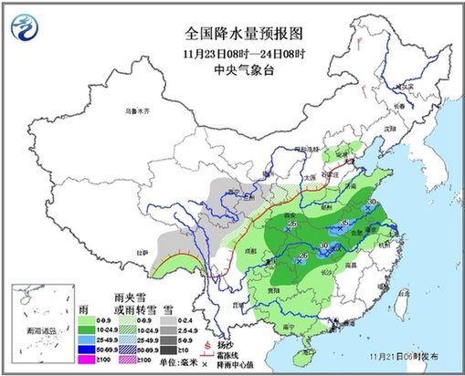 23日08时至24日08时,青海东部、甘肃南部、陕西中部、西藏东部、川西高原西北部等地有小雪(雨)或雨夹雪;西南地区东部、陕西南部、华北南部、江汉、黄淮、江淮、江南西部和北部、华南中西部等地有小到中雨,局地大雨。渤海将有4~5级的西南风转6~7级的东北风