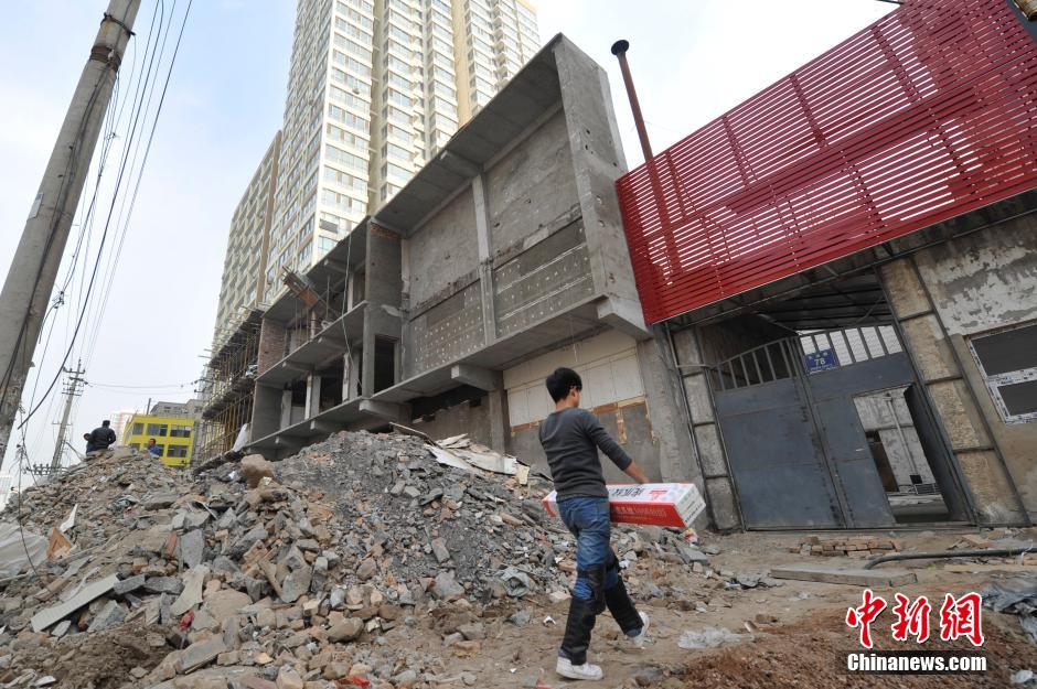 11月21日,在山西太原改造完工的长治路上,一座临街3层高的“楼片片”引起网络热议。据附近居民介绍,该楼原是城中村三层临街商铺的后墙,由于长治路拓宽,将其门脸拆除,唯独剩下这堵墙没有拆除。据观察,该楼最薄处只有20多厘米,被网友称为“楼片片”。 中新社发 武俊杰 摄