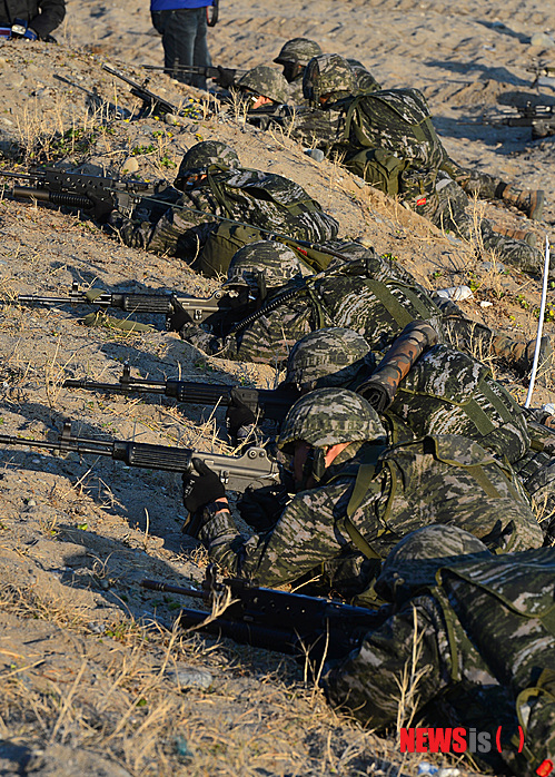 【环球网综合报道】据韩国纽西斯通讯社11月18日报道,韩国媒体18日公开了韩国海军和海军陆战队当天在庆尚北道浦项市北区海岸实施的“2014护国联合登陆演习”的内容和场景。
