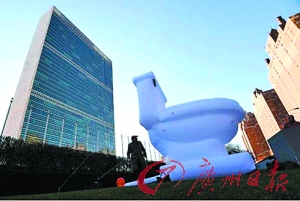 据悉,摆放在联合国门口的那只充气马桶高达4.5米,但当天因为风很大,只展示半天就泄气了。