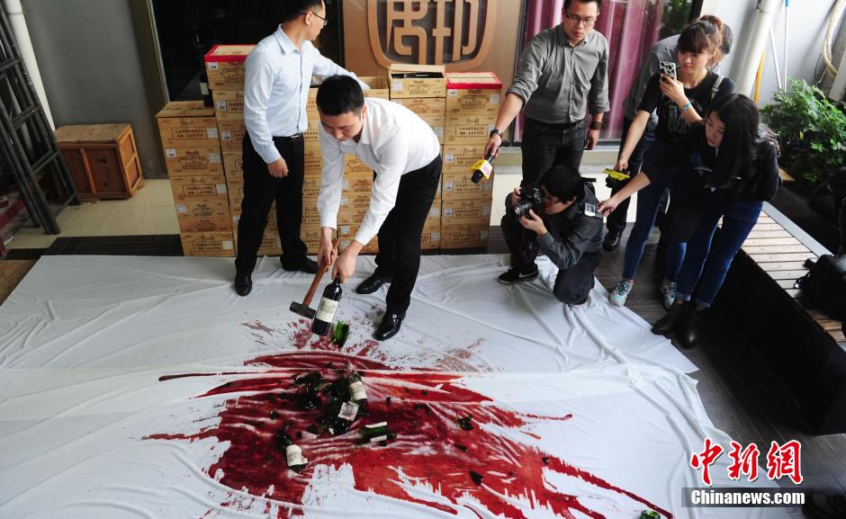 11月24日,深圳某酒业公司员工在办公区怒砸假“拉菲”酒,不让假拉菲流入市场。该公司于2012年5月21日通过拍卖公司拍得13069瓶红酒,总价值700余万元人民币,其中法国“拉菲”红酒346瓶。后经相关部门鉴定,227瓶为假“拉菲”。中新社发 陈文 摄
