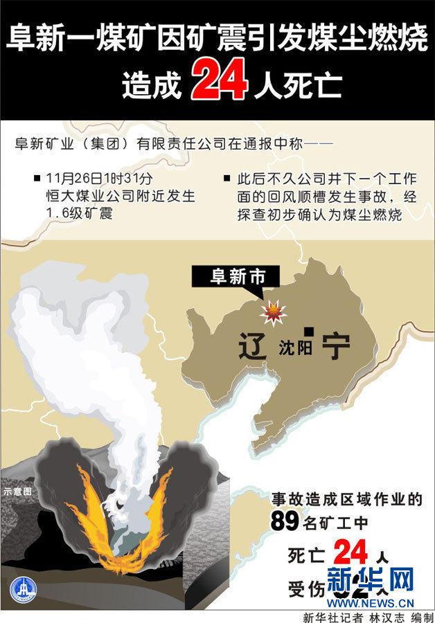 阜新一煤矿因矿震引发煤尘燃烧造成24人死亡 新华社记者 林汉志 编制