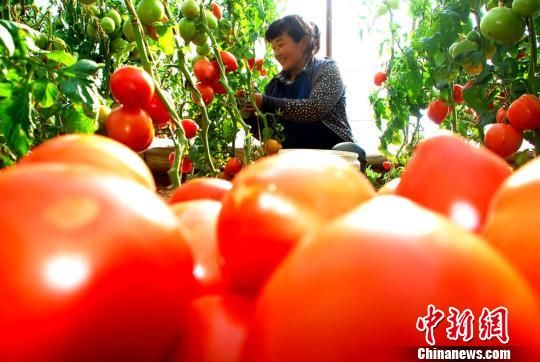 图为敦煌市月牙泉镇兰州村农民在温室中采摘西红柿。 张晓亮 摄