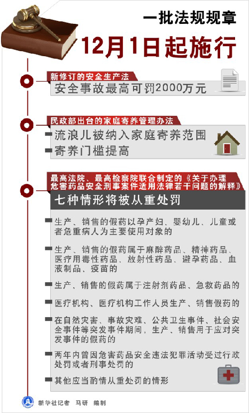 中国网12月1日讯 安全生产事故最高可罚2000万元、卖假药毒害孕产妇婴幼儿等七种生产销售假药情形将从重处罚、流浪儿被纳入家庭寄养范围……12月1日起,一批新的法规规章开始施行。