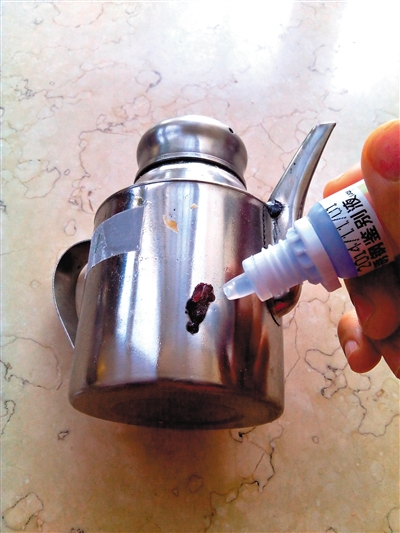 结果显示,不锈钢保温杯、不锈钢保温壶、不锈钢碗的表面没有发生任何变化,鉴别液依然是无色透明,基本为304钢(指铬含量达到18%、镍含量为8%的不锈钢,具备不锈钢器皿耐腐蚀抗锈的能力)。但不锈钢油壶滴有鉴别液的表面已被腐蚀成棕褐色,且用水冲洗不掉。不锈钢小水杯的表面则呈现棕红色,冲洗后颜色虽然能被擦拭掉,但表面依然能看到被腐蚀的痕迹。