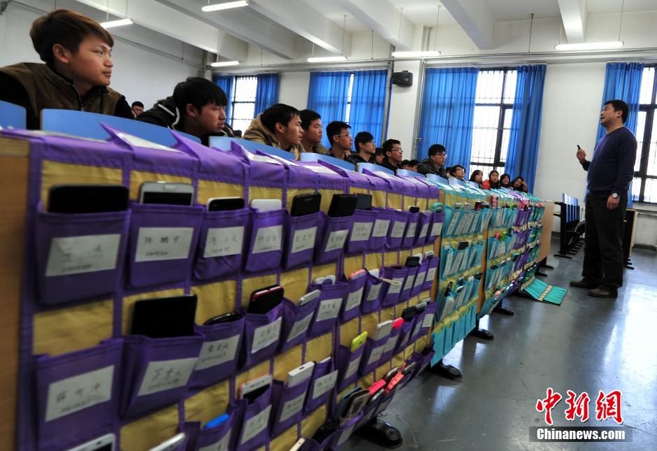 12月10日,河北师范大学信息技术学院课堂上,中央第一排桌椅空无一人,却专为学生手机私人订制了“座位”,学生们进入教室后,将手机对名入袋。据学校介绍,为解决“课堂低头族”现象,防止学生上课总玩手机,影响听课效果,实行“手机收纳、人机分离”的方案。学院为每个班配备手机收纳袋,袋上标明学生姓名和学号,上课前,将手机关闭或静音放入袋内,下课后自行取走。图为学生们抬着头,认真地听课。中新社发 翟羽佳 摄