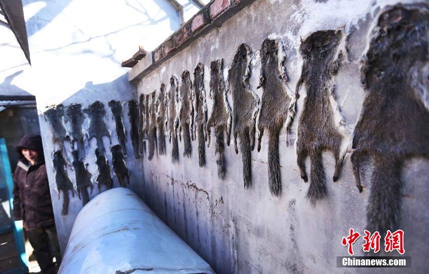 图为农户院内墙上整齐地挂着数排松鼠皮。 图片来源:CFP视觉中国