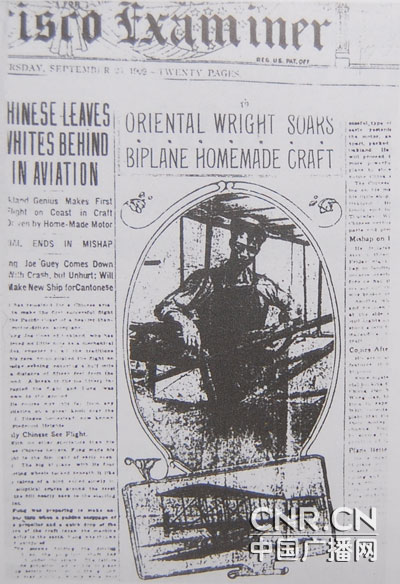 1909年9月23日美国旧金山《旧金山观察者报》以头版位置报道了冯如制造飞机和试飞的经过