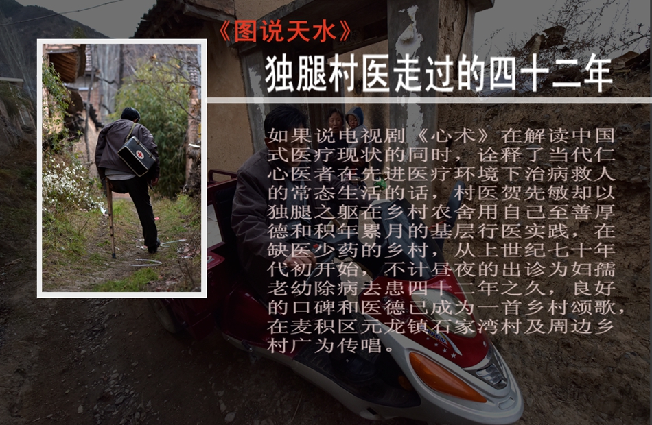 核心提示:如果说电视剧《心术》在解读中国式医疗现状的同时,诠释了当代仁心医者在先进医疗环境下治病救人的常态生活的话,村医贺先敏却以独腿之躯在乡村农舍用自己至善厚德和积年累月的基层行医实践,在缺医少药的乡村,从上世纪七十年代初开始,不计昼夜的出诊为妇孺老幼除病去患四十二年之久,良好的口碑和医德已成为一首乡村颂歌,在麦积区元龙镇石家湾村及周边乡村广为传唱。