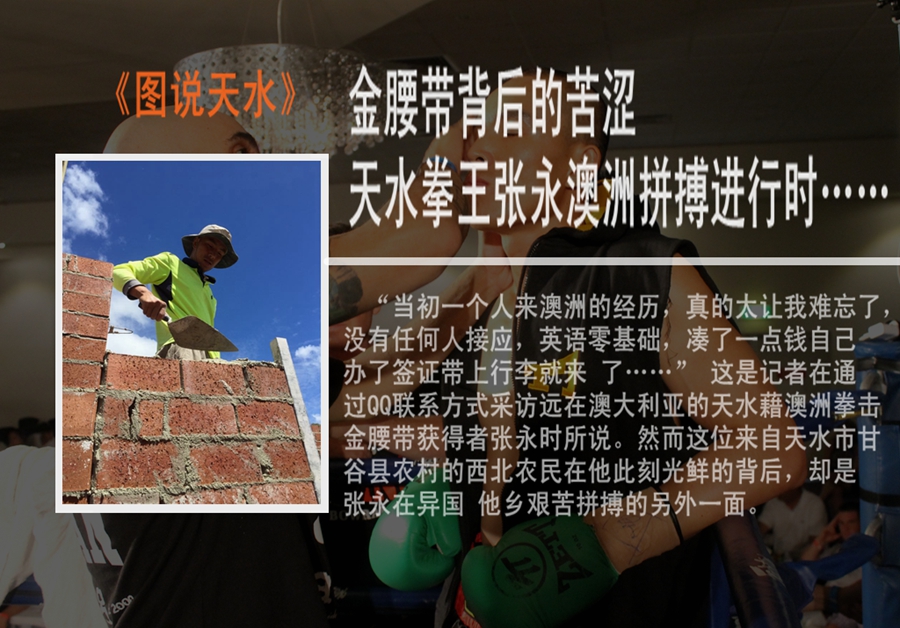 “当初一个人来澳洲的经历,真的太让我难忘了,没有任何人接应,英语零基础,凑了一点钱自己办了签证带上行李就来了……” 这是记者在通过QQ联系方式采访远在澳大利亚的天水藉澳洲拳击金腰带获得者张永时所说。然而这位来自天水市甘谷县农村的西北农民在他此刻光鲜的背后,却是张永在异国他乡艰苦拼搏的另外一面。