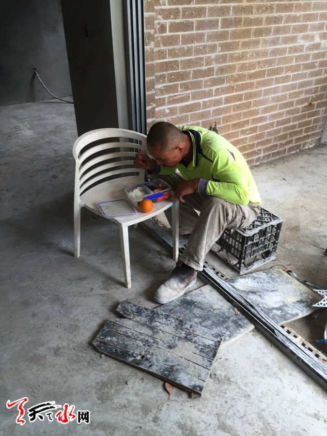 张永在工地上吃午饭,象这样的生活场景,对于在澳大利亚的他来说,已经是一种生活的常态。