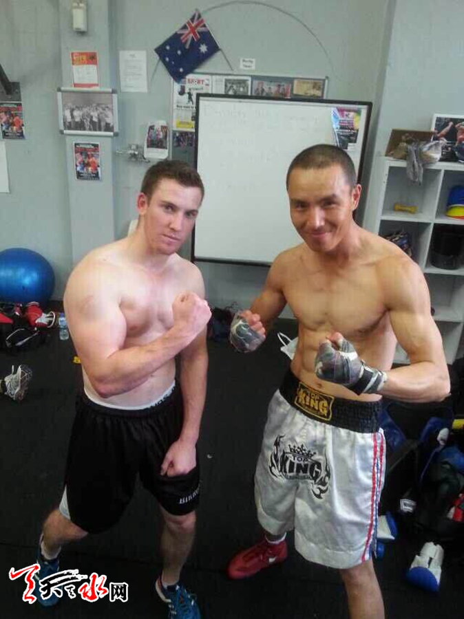 第一个获得职业拳击中量级洲际拳王头衔的中国人张永在作训练前的准备