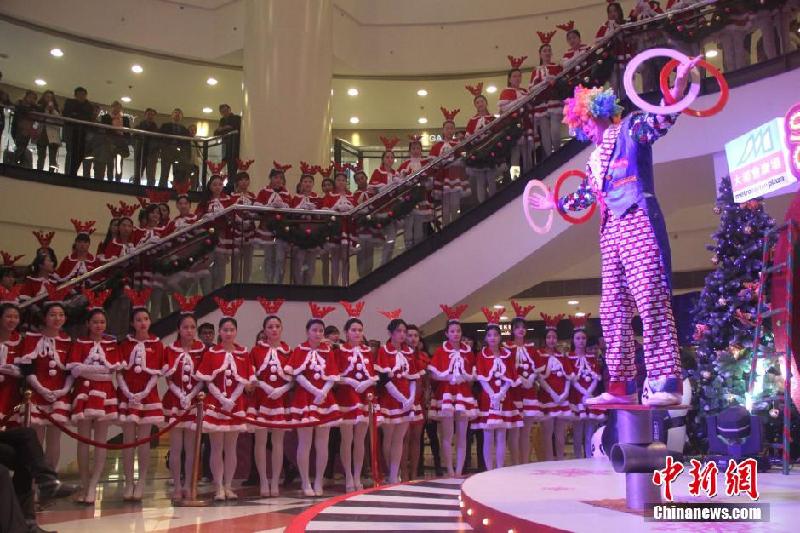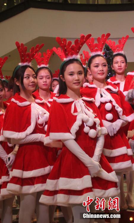 12月20日,100名身着红色圣诞服饰的“萌妹子”亮相重庆大都会广场,提前预热圣诞气氛。韩璐 摄