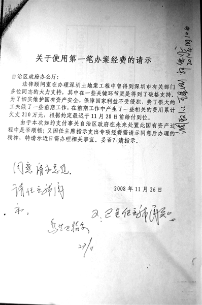 2008年11月26日,一份“关于使用第一笔办案经费的请示”报告称:“法律顾问室在办理深圳土地案工程中曾得到深圳市有关部门多位同志的大力支持,其中在一些关键环节更是得到了破格支持。为了切实维护国有资产安全,保障国家利益不受侵犯,费了很大的工夫做了一些前期工作,在前期工作中产生了一些相关的费用累计欠支210万,根据约定最迟于11月28日前给付到位。由于本次如约支付事关自治区政府在未来处置此国有资产过程中是否顺畅;又因任主席指示支出专项经费需请示同意后办理的精神,特请示近日需办理相关事宜。妥否?请指示。”