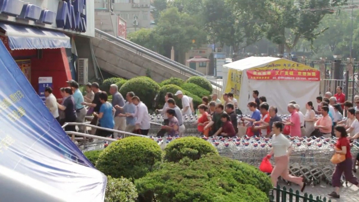 2014年12月18日报道,这组图片由两名外国人Jonathan Meador和Jonathon Lim从14楼高层阳台拍摄记录,它们展示了不同季节上海一家乐购超市门口,大批年龄在60岁以上的老人早早在店门口排队等候,待开门后蜂拥挤进超市的场景。