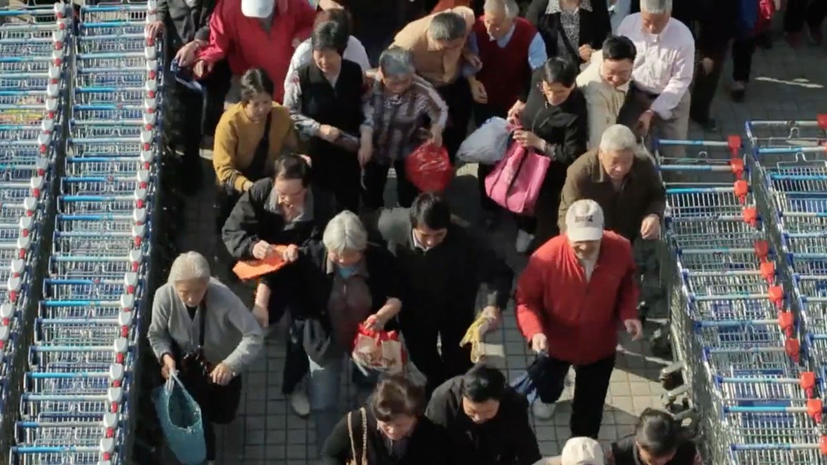 2014年12月18日报道,这组图片由两名外国人Jonathan Meador和Jonathon Lim从14楼高层阳台拍摄记录,它们展示了不同季节上海一家乐购超市门口,大批年龄在60岁以上的老人早早在店门口排队等候,待开门后蜂拥挤进超市的场景。