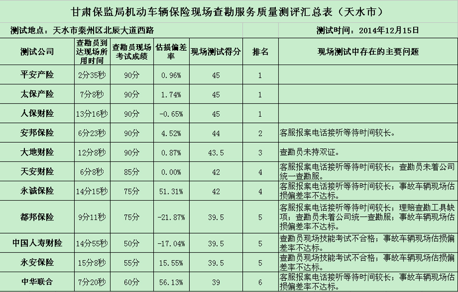 天天天水网讯 (记者 黄虹)保险公司哪家强,理赔测评见真章,近期省保监局和市保险协会对我市11家保险公司的车险理赔服务进行了公开测评,并公布了测评结果,结果显示中华联合以及永诚保险两家保险公司的估损偏差率竟然超过50%,另外个别保险公司也存在客服报案电话接听等待时间较长;查勘员未着公司统一查勘服等问题。