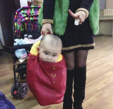 坐标地址显示温州的网友“苏乐乐要加油”发布了这则微博,配图中她本人一手提着这只装着自己儿子的红色包包,宝宝表情呆萌可爱,另一只手对镜头比出剪刀手。经过不少转载之后,一些网友质疑她是不是亲妈,认为这样的行为有虐待儿童的嫌疑。网友“小意囡”表示“这样小孩子很容易被卡到,非常危险”。但也有一些网友搞笑地称“到底包是买的,还是宝宝是买的”以及“逛了一圈买了个‘小孩’过来,还蛮可爱的”。