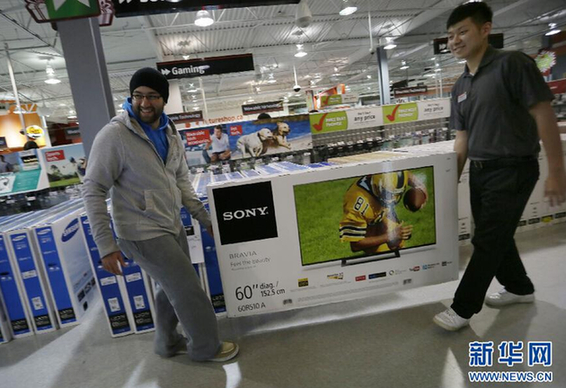 12月26日, 在加拿大温哥华,人们在电器店内抢购打折电视机。 当日是加拿大一年一度的节礼日,当地商家会将货品大幅减价,吸引民众抢购高折扣商品。新华社发(梁森摄)