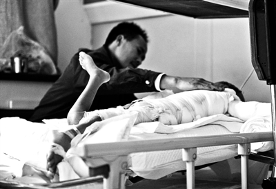 昨天下午,北京青年报记者来到空军总医院,在进入烧伤科病房的地候,张冬正拿着一个小吹风机对着雯雯的背部慢慢地吹。此时的雯雯正趴在床上,闭着眼睛,眼角挂着一丝泪痕,不停地小声呻吟。