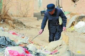 近日,虽然天气寒冷,但在榆中县城街头,经常能见到一位身材矮小、脊背佝偻的老人手里拎着一根树枝,在垃圾堆或垃圾桶前翻找,每当发现一个易拉罐,老人便如获至宝,急忙装进一个环保布袋里。