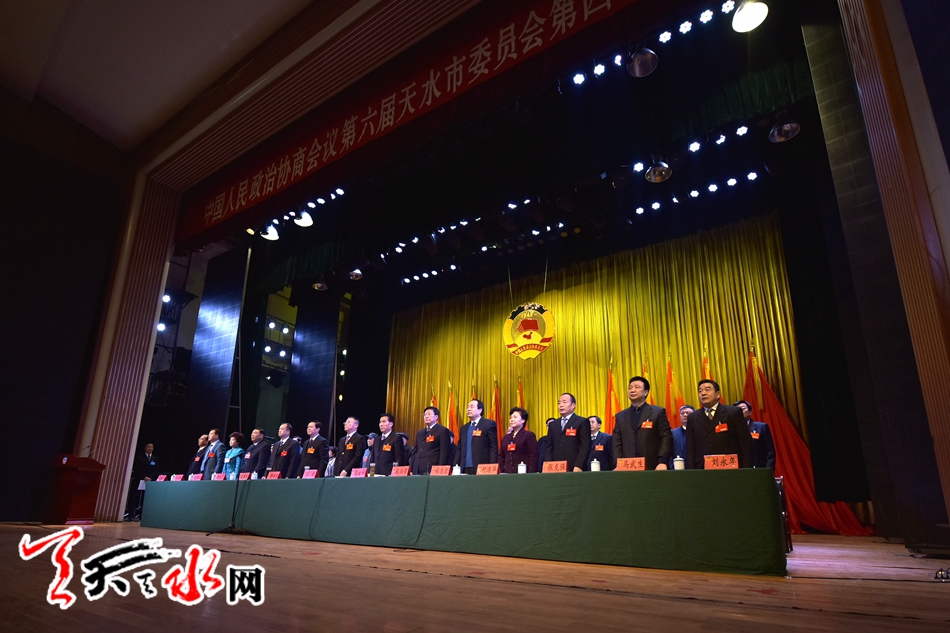 天天天水网讯【记者 胡丽霞 杨璟】 1月14日上午,政协第六届天水市委员会第四次会议在秦州区隆重开幕。大会主会场秦州剧院内,洋溢着和谐奋进的气息。主席台上方,10面鲜艳的红旗簇拥着中国人民政治协商会议会徽,相互辉映,庄严喜庆。