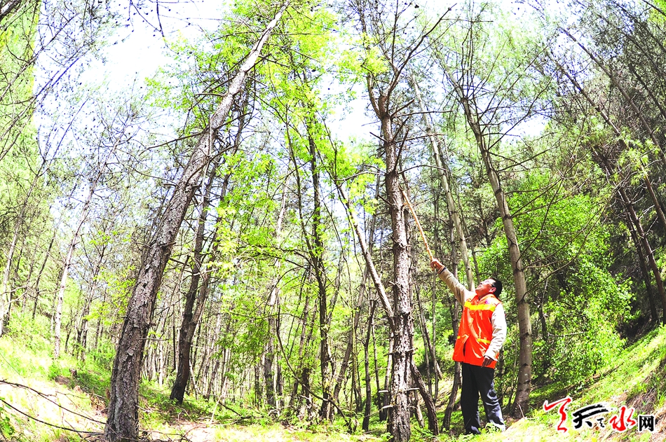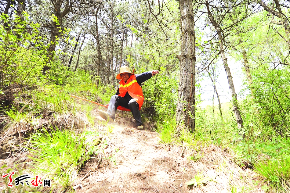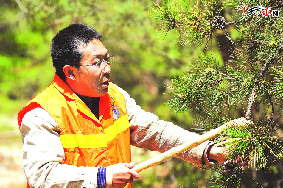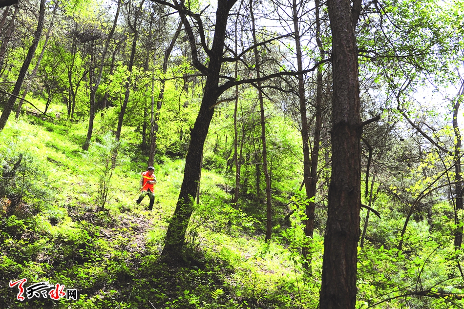走进初夏的清水县尖山林场,绿意盈盈,花香鸟语,云杉、国槐、柳树、杨树、侧柏等多种乔灌木挺拔耸立,郁郁葱葱。今年49岁的马小康是一名防火护林员,在这里负责尖山林场风台梁3800多亩林木的防火和管护工作。