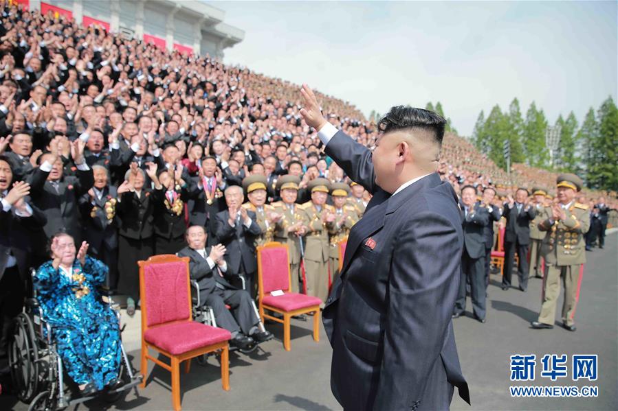 朝中社5月13日提供的照片显示,朝鲜最高领导人金正恩(前)5月12日在平壤4·25文化会馆与朝鲜劳动党第七次全国代表大会与会者合影。朝鲜劳动党政治局常委金永南、黄炳誓、朴凤柱、崔龙海陪同出席。新华社/朝中社