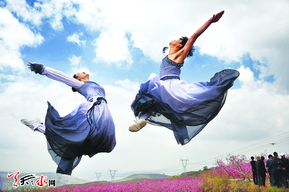 对角线构图的运用,因为把主体安排在对角线上,使得立体感、延伸感和运动感大大增强。而仰角度机位亦使画面更加纯粹,主体更加突出。唯一不足,可能是人太挤的原故,下面桃林花海舍弃稍多,削弱了画面环境语言的表达力。