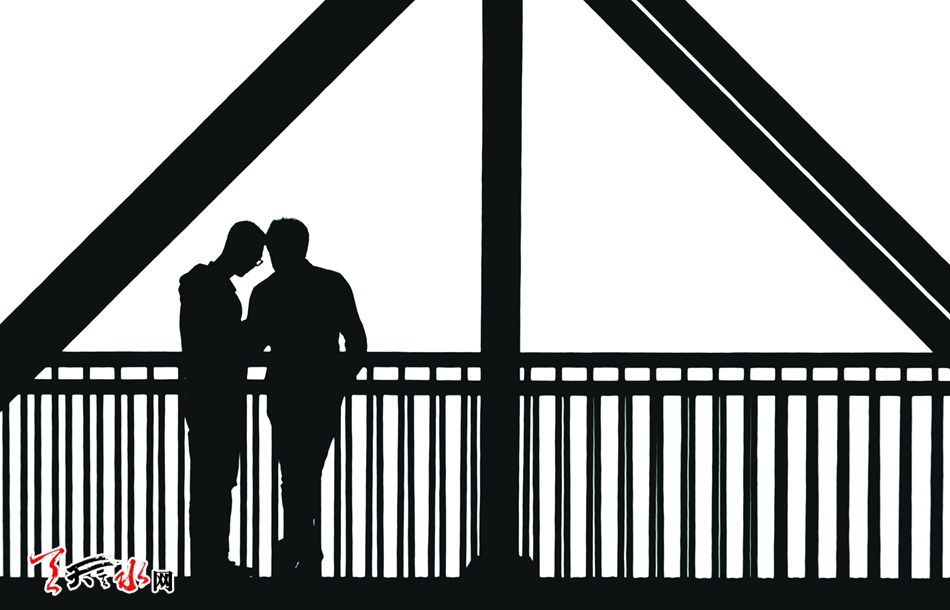 构成意味很足。明亮的天空让剪影更加符号化,硬朗的线条如框,构建起两个男人此刻窃窃私语的私人空间,虽然他们的谈话内容不得而知,但下半部密集的栏杆却给了读者一种想象的暗示指引。好吧,密集物体恐惧症者慎入,因为他们的秘密会被你破解。