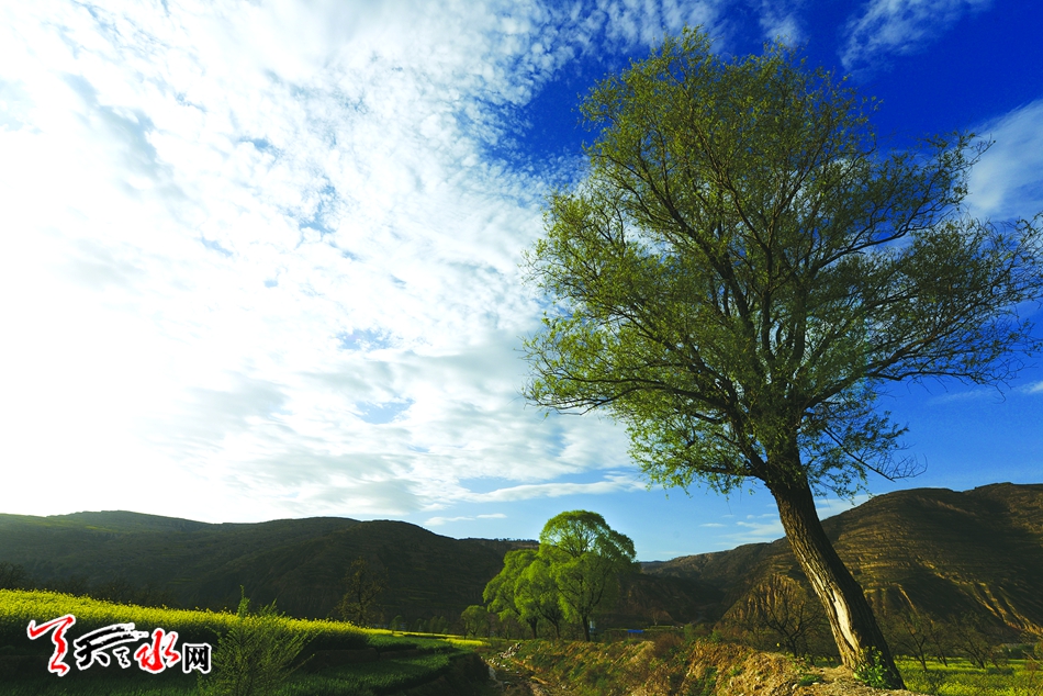 该是夕阳西下了,三阳川,应该是那一块吧,一片斜阳静静地照着,油菜花很害羞地露出一小溜亮丽的黄,似三阳川农家的女儿,而倾身向着她,向着光明的大树,则使画面有了一股不可遏制的动势。