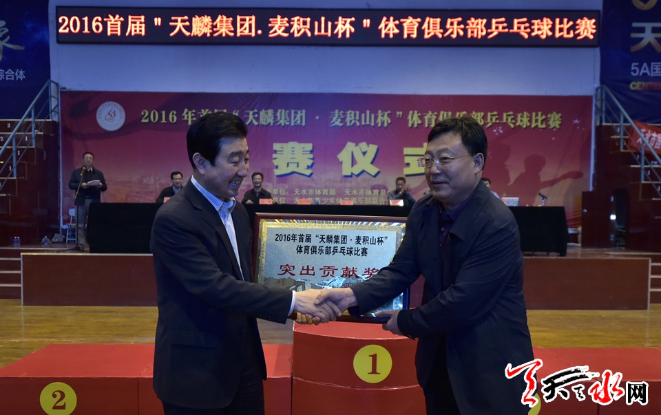 霍卫平为首届“麦积山杯”体育俱乐部乒乓球比赛赞助单位授牌