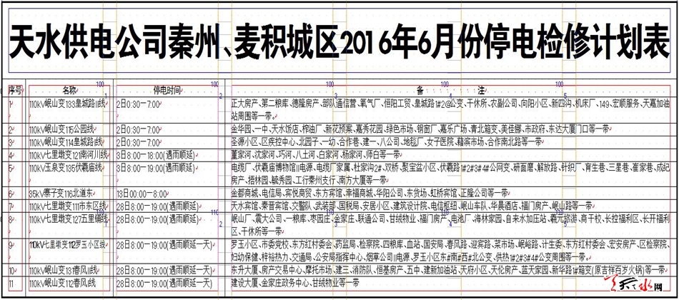 天水供电公司秦州、麦积城区2016年6月份停电检修计划表