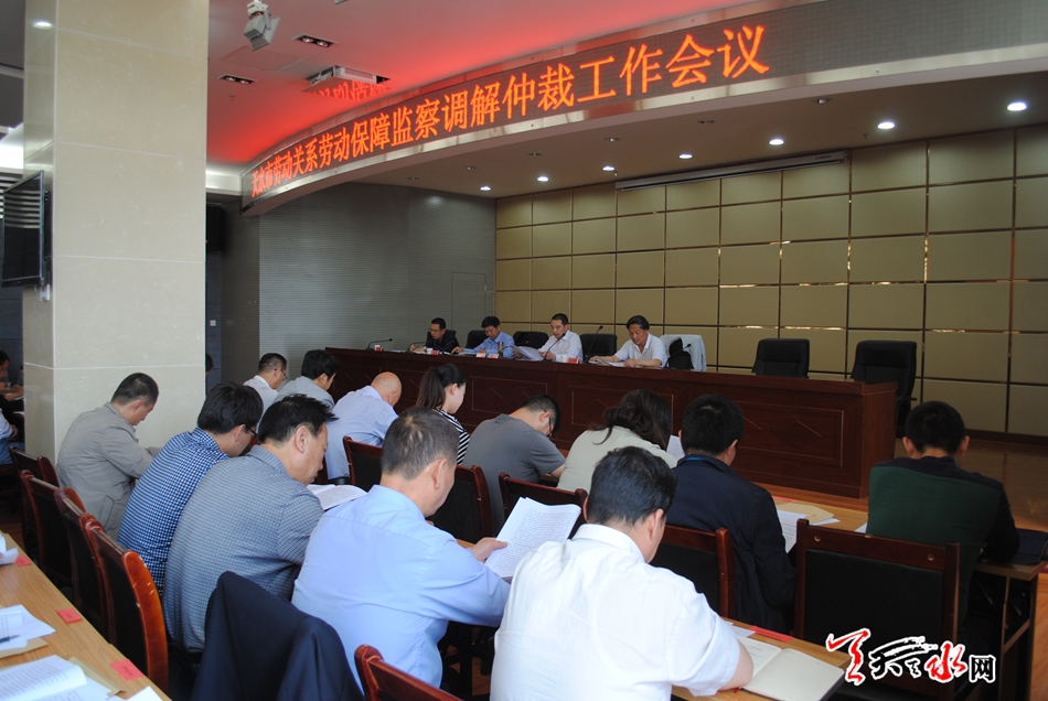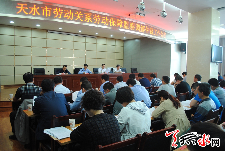 天天天水网31日16时讯【记者蔚军平】5月31日下午,天水市召开劳动关系、劳动保障监察、调解仲裁工作会议。贯彻落实全国、全省劳动关系工作会议,回顾总结2015年全市劳动关系取得的成绩,分析所面临的形势和任务,对今后构建和谐劳动关系工作进行了安排部署。