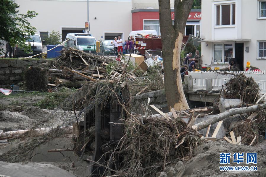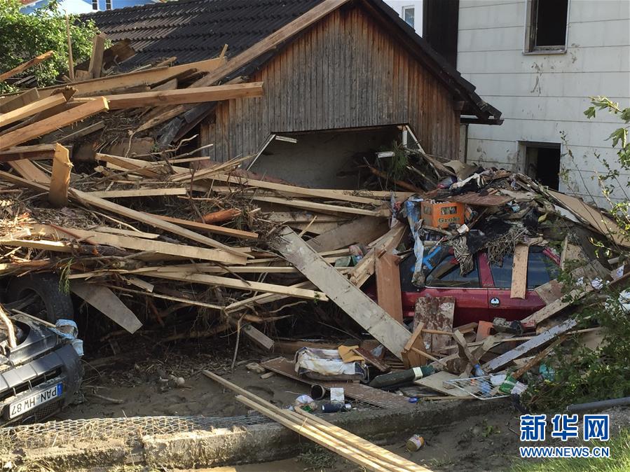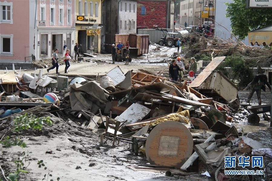 6月3日,在德国南部巴伐利亚州因河畔辛巴赫镇,大水退去后街道一片狼藉。