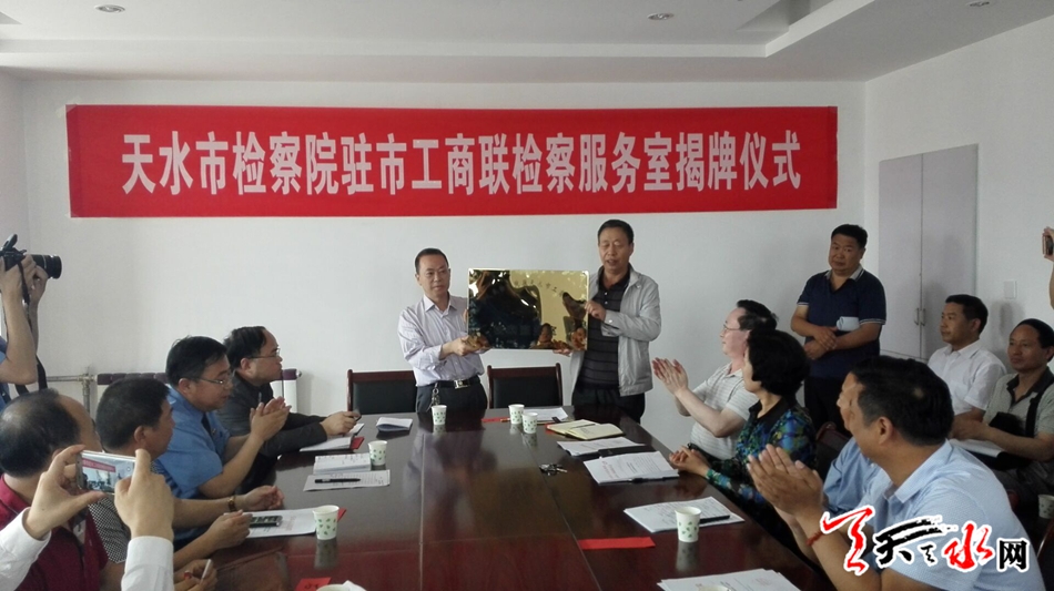 天天天水网8日17时讯 【记者 赵晓玲】6月8日,市检察院驻市工商业联合会检察服务室成立并举行揭牌仪式,这是市检察院与市工商业联与非公有制经济发展服务的具体措施。通过设立检察服务室,搭建服务平台,实现联系服务、法律监督和司法保障等各项工作全覆盖,形成整体工作合力。