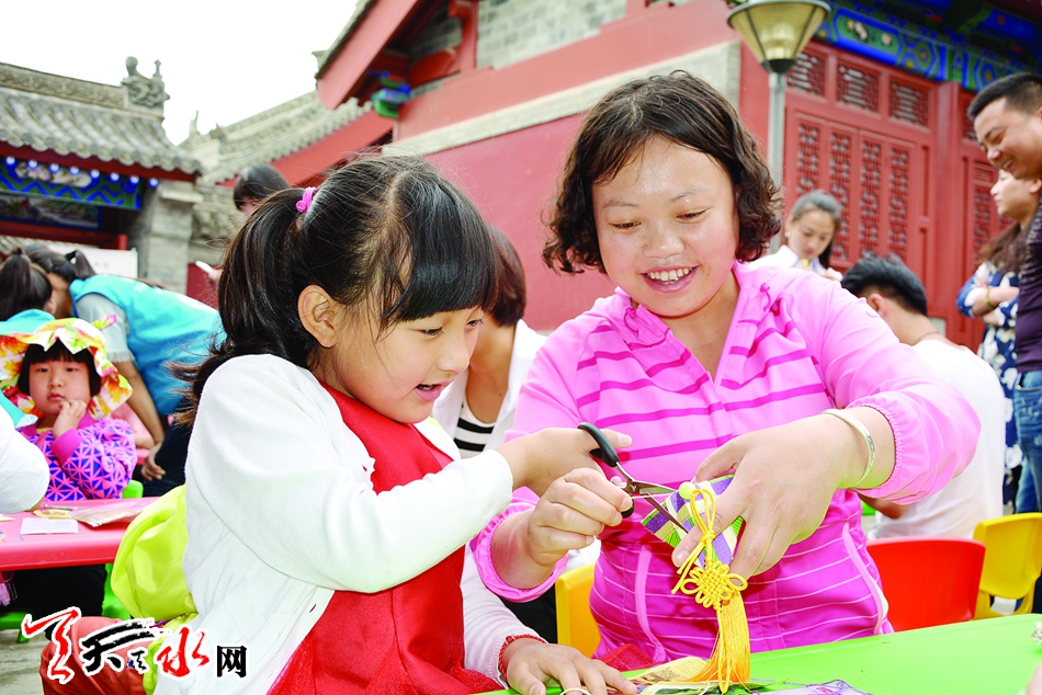 “真是太好玩了,以前每个端午节,都是爸爸妈妈给我买的香包,虽然制作精美,但是我拿一会儿就不喜欢了。今年的端午节真是太有意义了,这是我第一次亲手做香包,而且在妈妈的帮助下,做的挺好,我要把它挂在我的书桌前,作为留念。”天水市实验小学的王郑源满脸充满了喜悦。今天在现场做得开心的,不光是小朋友们,所有的爸爸妈妈也是个个童心未泯、兴奋不已。他们暂时脱离了工作的困扰,一反往常地给孩子们耐心指导,看着孩子如此高兴,大人们也乐此不疲。