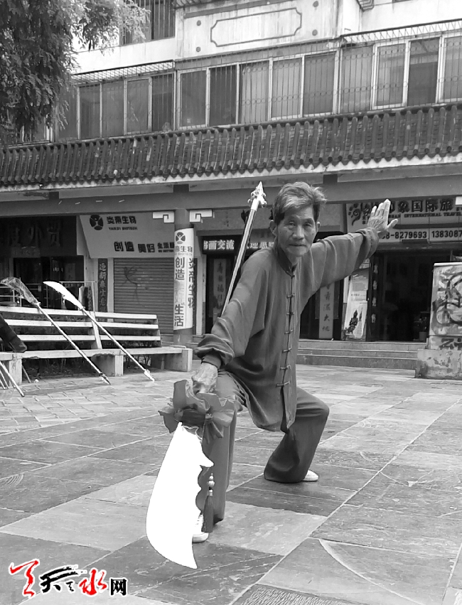 范栋智老人介绍说,他老家是河南的,几岁的时候随父母逃荒到西北,1943年最终落户到了天水。后来在天水钢厂上班。年轻时常常挨饿吃不上饭,身体不好,体弱多病,就想着通过习武锻炼身体,增强体质。1964年,开始跟着别人学习太极拳,逐渐地对刀、枪、剑、棍、棒、拳等十几种武术的套路都进行了学习,2003年拜天水武术协会的刘永生为师学习武术套路,有时自己也琢磨着练,断断续续一直坚持着练习。“那时很早就起床习武,练完武术之后再赶去上班,钢厂工作很辛苦,我是焊工,每天蹲着干活,常常感到腿痛、腰酸、背痛,有时腰都直不起来,去医院检查出第三、四、五腰椎都有骨质增生。但我还是坚持进行锻炼,1987年退休后更是比较全面学习了武术的各个套路。”