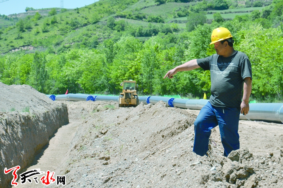 新6号隧洞外,沿河谷向南推进的输水管道管沟内,开挖管沟的工程人员顶着炎炎烈日,正在按照测量放线划定的线路有条不紊地推进着。放眼过去,开挖出来的管沟与粗大的黑色防腐管道并行蜿蜒,铺衬出天水城区引洮供水工程波澜壮阔的画卷。