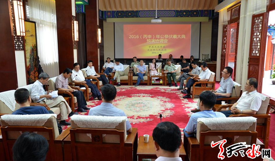 天天天水网讯【记者姬旺芳】2016(丙申)年公祭伏羲大典6月20日预演。6月18日,天水市委、市政府召开公祭伏羲大典预演协调会,听取各相关县区、部门汇报,安排部署公祭大典预演安保、宣传、供电、参祭现场组织管理等相关工作。
