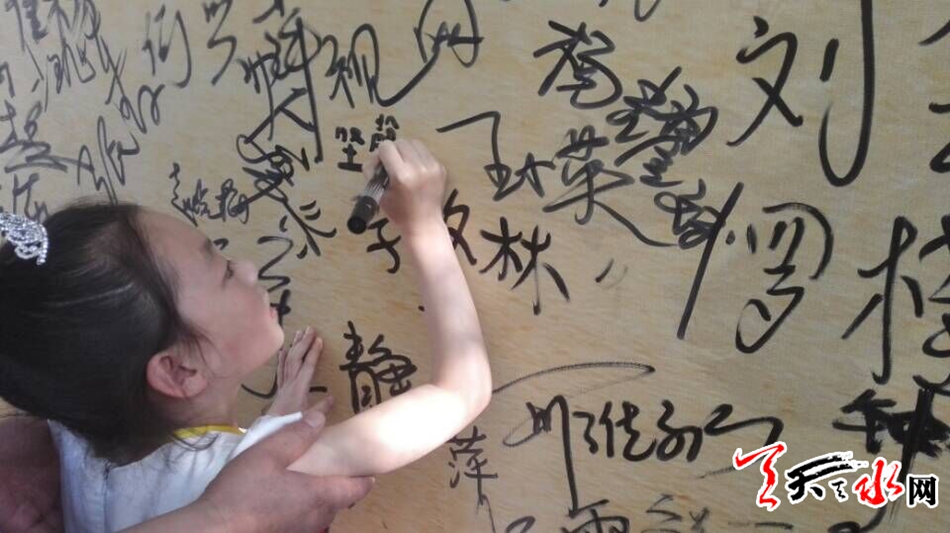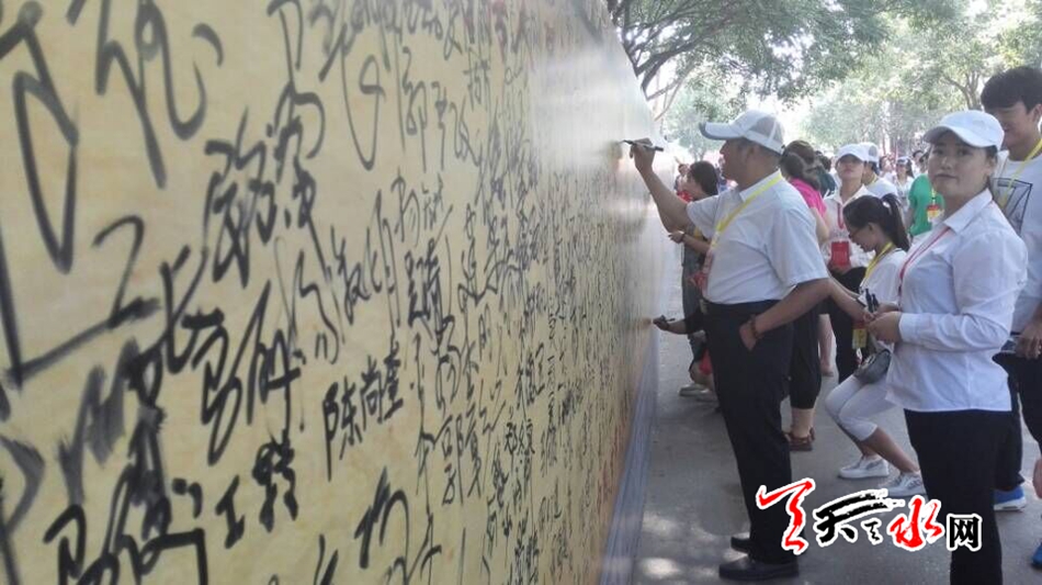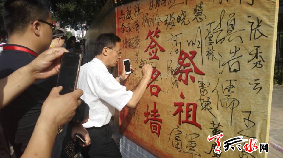 天天天水网22日9时讯【记者张文都 】6月22日,2016(丙申)年公祭中华人文始祖伏羲大典在伏羲庙广场隆重召开之际,来自五湖四海参拜伏羲的宾客、游人信步来到“祭祖•签名墙”边挥洒签名边拍照留念,在祭祖现场留下美好瞬间。