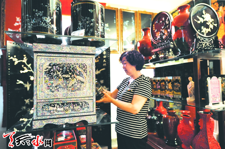 一走进位于公司二楼的展厅,各种造型精致、图案古朴的雕漆制品便呈现在了眼前,有首饰盒、屏风、花瓶、古琴等,让人眼花缭乱。“展示的这些只是成品中的一小部分,这上面的每一朵花、每一次镶嵌都由师傅们手工制作而成。”公司负责人赵成说,雕漆制品因漆质坚硬,耐酸耐碱耐高温,且既能观赏又可实用而在国内外享有盛誉。