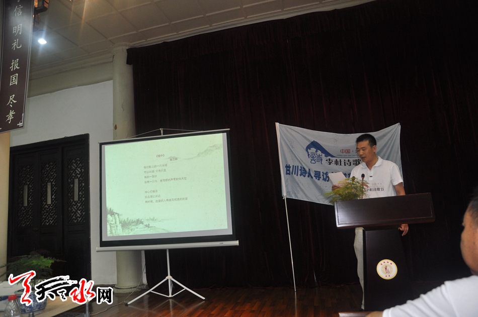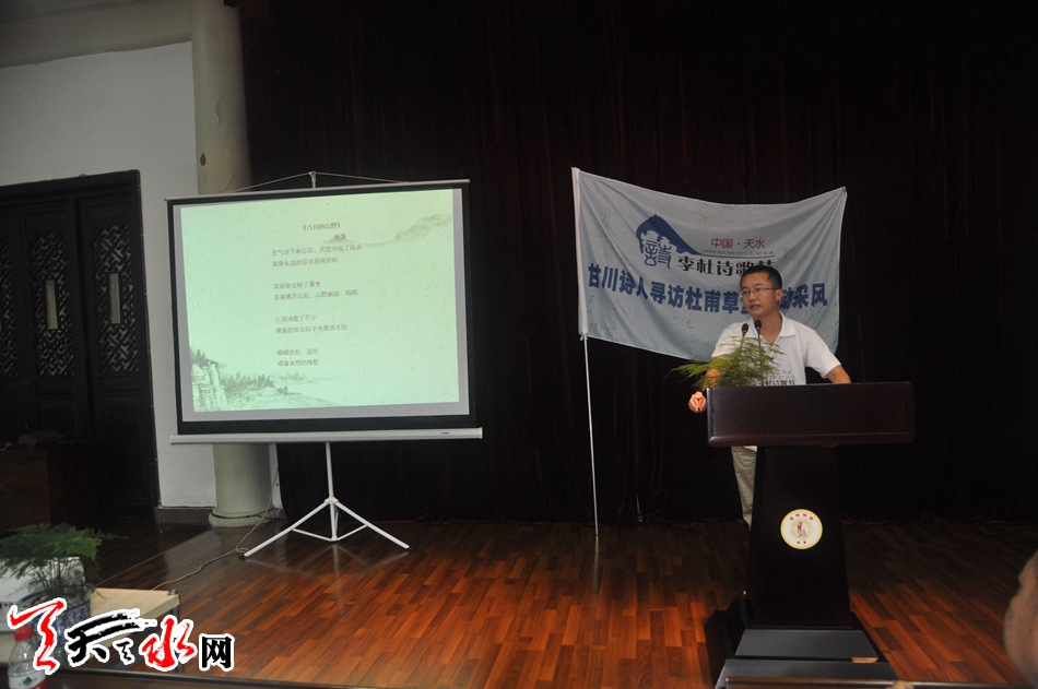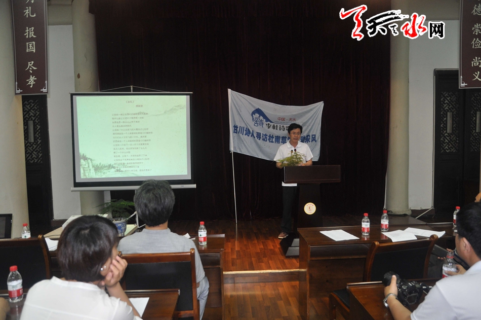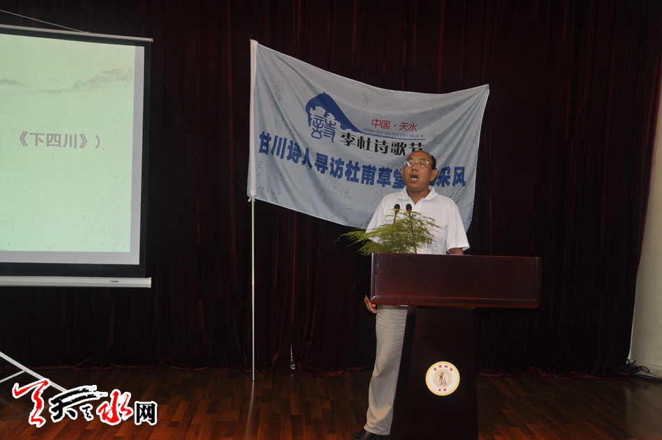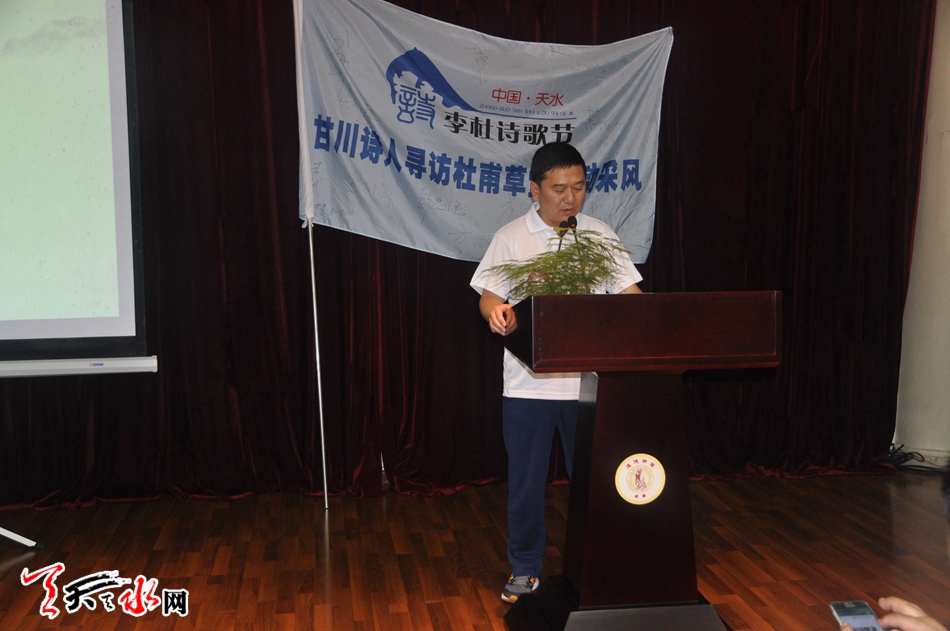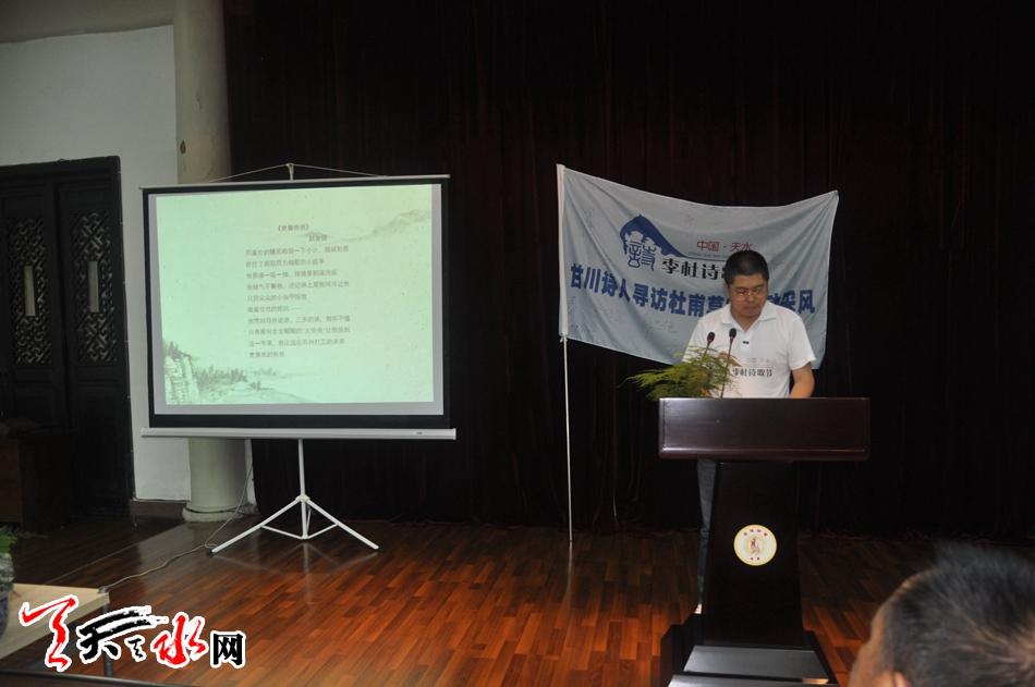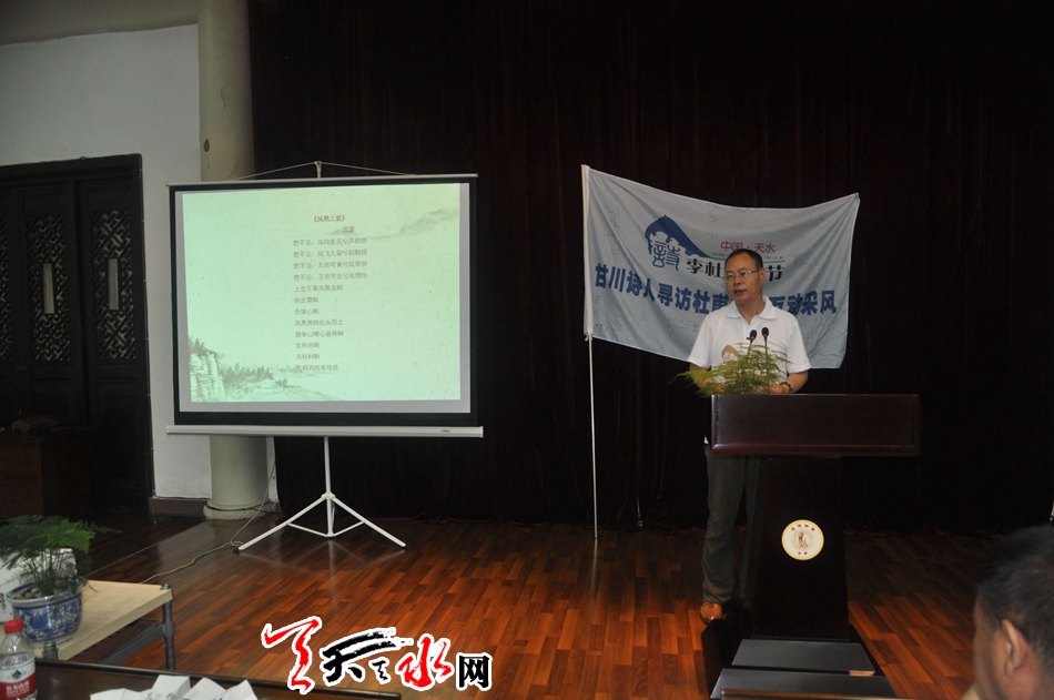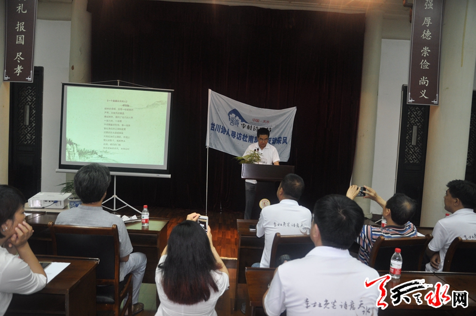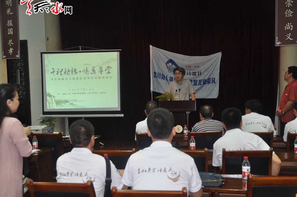 第二天一早,微雨飘落,为燠热的成都带来惬人的凉意,由星星诗刊社、成都杜甫草堂博物馆、天水市作协、成都商报联合举办的“千里诗缘,情系草堂”川甘两地诗人成都杜甫草堂诗歌朗诵会,在成都杜甫草堂藏书阁举行,川甘两地三十余位诗人参加朗诵会。朗诵开幕前,《星星诗刊》主编、著名诗人龚学敏致开幕词时说,甘肃诗人沿着杜甫当年的路径造访成都杜甫草堂,是向杜甫致敬,也是向诗歌致敬。 王若冰在答谢词中介绍了杜甫流寓天水时的创作及生活状况,并代表全体采风团诗人向杜甫鞠躬致敬,为1200多年前杜甫在秦州遭遇的生活磨难向杜甫致歉。朗诵会上,与会诗人不仅以原创诗歌表示对一代诗圣杜甫的敬意,诗人丁念保的天水民歌《下四川》更引起四川诗人的阵阵掌声。当天下午,成都商报《诗歌集结号》微信公众号以《他们从甘肃踏着杜甫足迹到成都只为向诗歌致敬》为题,报道了朗诵活动。接下来,采风团在《星星诗刊》编辑部编辑、诗人陪同下参观了武侯祠、金沙遗址及宽窄巷子。25日离开成都返回天水途中,采风团还寻访了江油李白纪念馆、青莲镇国际诗歌小镇,并沿1257年前杜甫从天水南下四川路线逆行,走访了剑门关、白水故道、徽县栗亭杜公村杜公祠遗迹。
