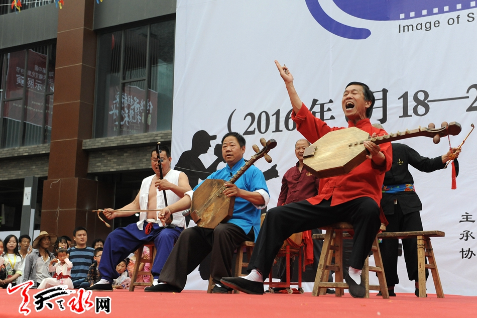 摄影双年展期间,我市举办了一系列的文艺展演活动,充分展现天水深厚的历史积淀和创新发展的魅力。清水轩辕鼓、张家川花儿、甘谷皮影戏、武山春秋大刀、秦州唢呐、麦积小曲、武山旋鼓舞等非物质文化遗产和极具地方特色的民间民俗文化尽展风采。秦州鞭杆舞、秦州黑社火、秦腔等专场演出活动让观众有迷醉之感,为摄影年展注入了一份生机勃勃的文化内涵。(天天天水网记者 何永德 胡丽霞摄)