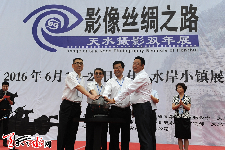 ▲甘肃省委宣传部巡视员、甘肃省记协主席张瑞民,天水市人大常委主任柴金祥,青海省文联主席张民共同启动“影像丝绸之路——天水摄影双年展”