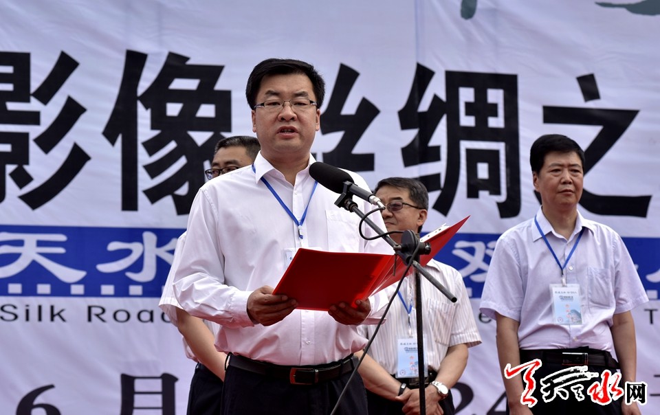 ▲甘肃省委宣传部巡视员、甘肃省记协主席张瑞民,天水市人大常委主任柴金祥,青海省文联主席张民共同启动“影像丝绸之路——天水摄影双年展”
