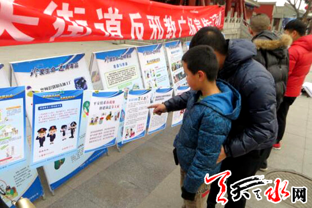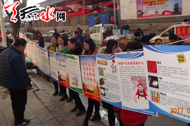 街道、社区利用宣传板报、发放宣传册等形式,在伏羲广场、双桥流动人口务工人员交易市场、坚家河市场、环西居民小区、街道旁等人流量多的地方进行宣传,从什么是邪教,邪教的危害,如何抵制邪教侵害等方面对邪教进行广泛宣传。同时,通过大量案例使广大居民群众认清了邪教的危害,做到远离邪教、反对邪教、抵制邪教。