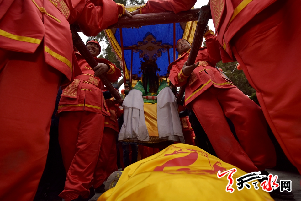下午三时三十分,方神黑爷在浩浩荡荡仪仗队伍的簇拥之下,进入伏羲庙,落座于先天殿月台之上西侧。主祭人明烛、焚香、化表。方神黑爷拜过伏羲之后,仪仗队伍出伏羲庙,随抬着榜文的仪仗队伍绕伏羲城一周。沿路商铺皆鸣炮相迎,以示敬仰。最后,主持人明烛、焚香、化表、献茶之后,将榜文焚烧,由专人将榜文燃烧后的灰和圣水送至藉河中,祭祀仪式即告毕。