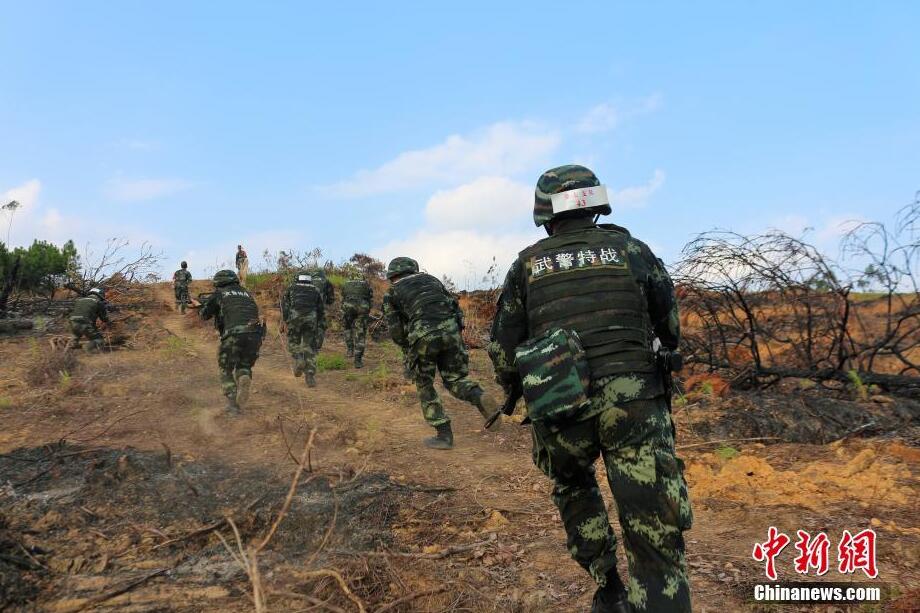 近日,武警广西总队第三季度“魔鬼周”极限训练打响,两百余名特战队员集结防城港开展武装奔袭、山林地搜捕、快速抢救伤员、穿越封锁线、抢占高地等极限体能科目训练,场面激烈堪比电影大片。图为集训队进行战术考核。李章禄 摄