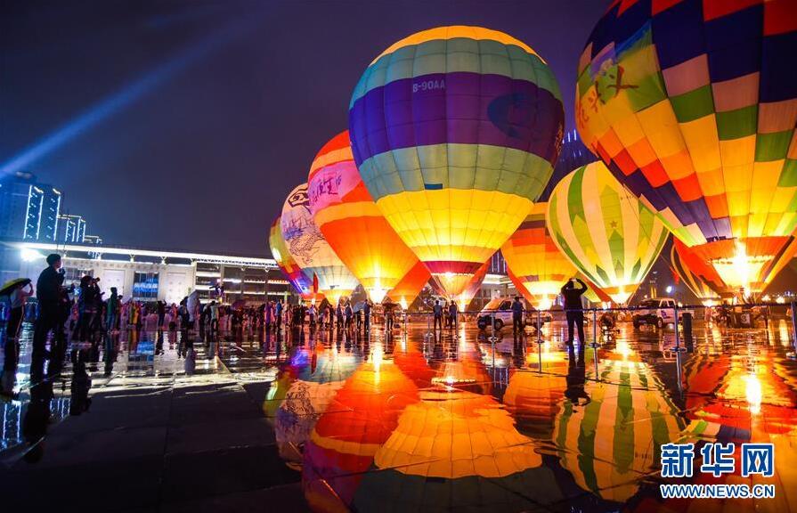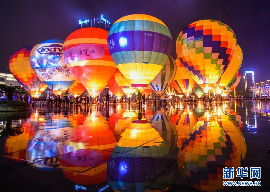 10月14日,人们在贵州省兴义市桔山广场欣赏五彩缤纷的热气球。 新华社发(刘朝富 摄)